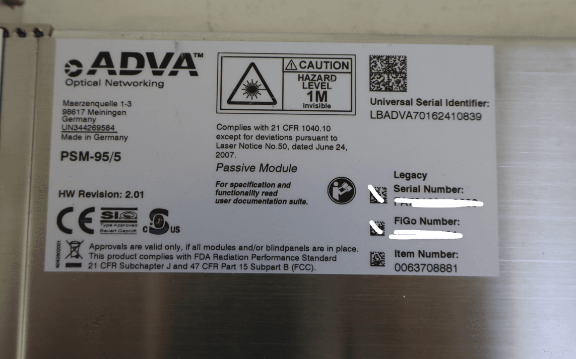 The PSM-95/5 module is built for use in ADVA FSP 3000 shelves and provides consistent power distribution across optical and system modules. The label shows compliance with 21 CFR 1040.10 and Laser Notice No. 50, confirming adherence to telecom-grade safety standards. The module includes a universal serial identifier (USI) for platform tracking and a legacy serial number for operational inventory management. Because it is a passive module, thermal output and failure risk remain low. Its structure supports long-term deployment in optical transport nodes, and the enclosure design is suitable for rack-mounted ADVA chassis. It works alongside active power units, transponders, amplifiers and control cards.